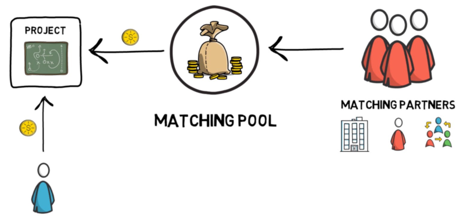 Quadratic funding is a matching mechanism that favors projects with broad community support over those with a few wealthy backers. Instead of matching dollar-for-dollar, the match is calculated by the square root of each contribution summed up, then squared. This means that 100 people donating $1 each generates more match than one person donating $100.