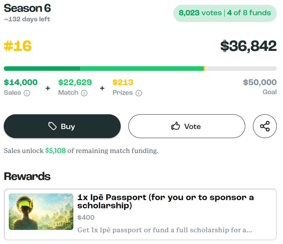 Ipê Village keeps climbing on Artizen. When we closed this edition, we were at #16 with $36,850 raised and 8,029 votes — 74% toward the $50k goal. By the time you read this, we’re probably higher. If you haven’t voted or donated yet, this is the moment.