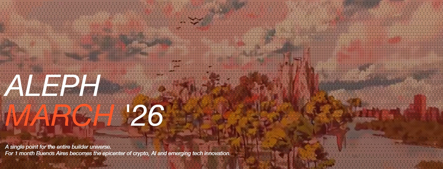 Crecimiento is bringing back Aleph for its fourth edition, running March 4-26 in Buenos Aires. The month-long event is structured into four themed weeks: Opening Week (deep tech, agentic crypto), Institutional Week (Fintech Summit, Regulation Day), Startup Week (Demo Day, Aleph Hackathon), and Crypto Week (Privacy and DeFi Summits). Partners include Protocol Labs, Lisk, Edge City, and dozens of ecosystem organizations.