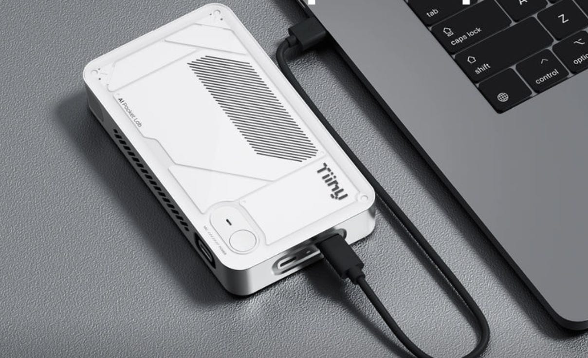 Tiiny AI‘s Pocket Lab, unveiled at CES, is a palm-sized computer that runs models up to 120B parameters with 80GB memory and 20+ tokens/s. Plugs into your laptop via USB, ships with TiinyOS for one-click open-source model downloads. No subscription, no token fees, no constant internet.