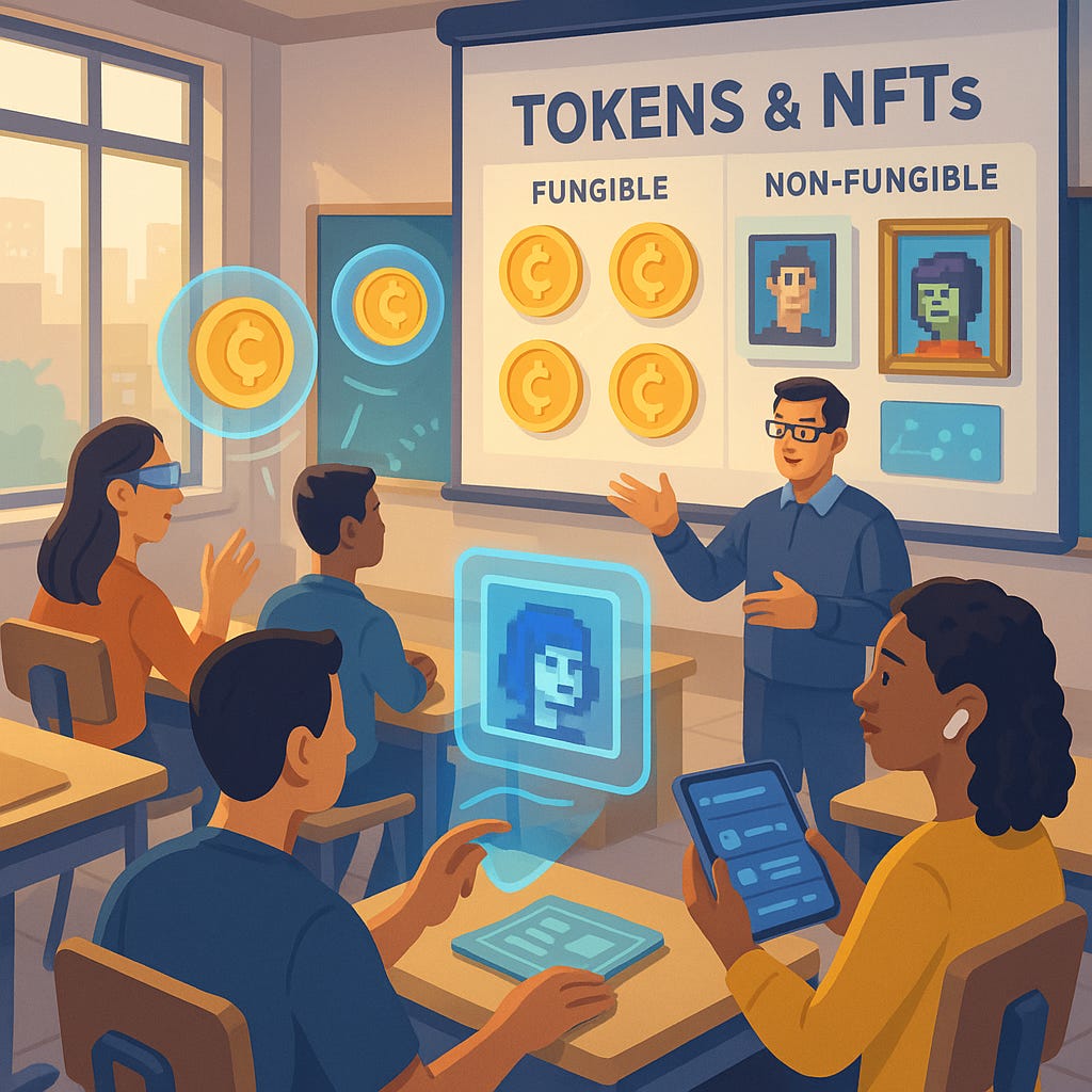 Non-Fungible-Tokens are unique tokens popularized by expensive JPEGs, but they can be a lot more, from IP assets to deeds of ownership. Tokens are the fungible version of this (think divisible), including memecoins!
